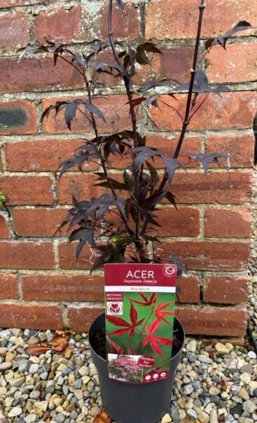 This purple-leaved Japanese maple is deciduous and slow growing with an upright growing habit that will develop into a small tree making them suitable for both smaller and larger gardens. Acers are known for their autumn colour and this variety turns from purple to a stunning bright red. Acers grow best in partial shade sheltered from strong winds and should be kept moist but well drained. They are also suitable for gardens with clay soil and can be grown in pots or in the ground.