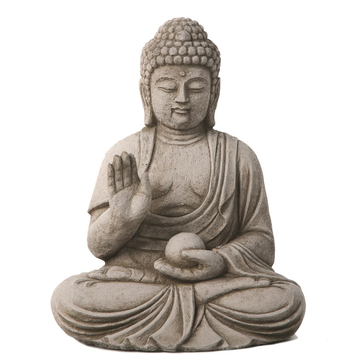 Traditional statue of the deity sitting in the lotus position holding an orb in one hand with palm of the right hand pointing upwards. Wearing a fine-detailed robe and beaded headgear• Cast-Stone • Manufactured in Britain • Quality finish