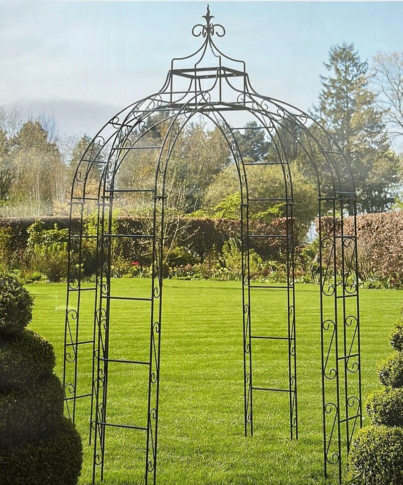 A stunning focal point for your garden! Handcrafted from heavy duty round steel, this gazebo is beautifully designed with decorative panels ready for your choice of climbers to be trained up and over the structure. There is a tall central tower with a majestic finial to add further interest to the gazebo.