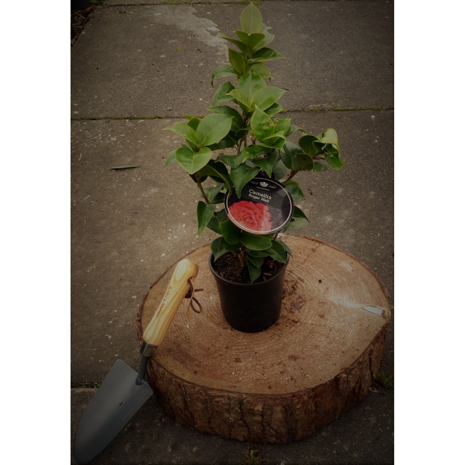 Camelia Roger Hall is an evergreen shrub with dark green glossy leaves and a stunning double red flower in winter and spring. Camelia's require acid soil so they should be planted with ericaceous soil and fed with ericaceous plant food from March-October. Camelia's grow best in shade, although they can have some sun later in the day. If they are planted in a position where they get the early morning sun they won't flower as the sun hitting any frost on the buds and flowers will damage them and cause them to drop off.