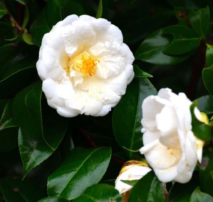 Camelia Biancais an evergreen shrub with dark green glossy leaves and large white flowers in spring. They require acid soil so they should be planted with ericaceous soil and fed with ericaceous plant food from March-October. Camelias grow best in shade, although they can have some sun later in the day. If they are planted in a position where they get the early morning sun they won't flower as the sun hitting any frost on the buds and flowers will damage them and cause them to drop off.