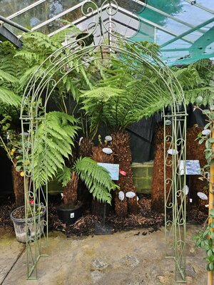 A handcrafted garden arch made from heavy duty steel and finished in heritage sage green. Topped with scrolled finial ideal to frame an entrance and create the wow factor in a garden.