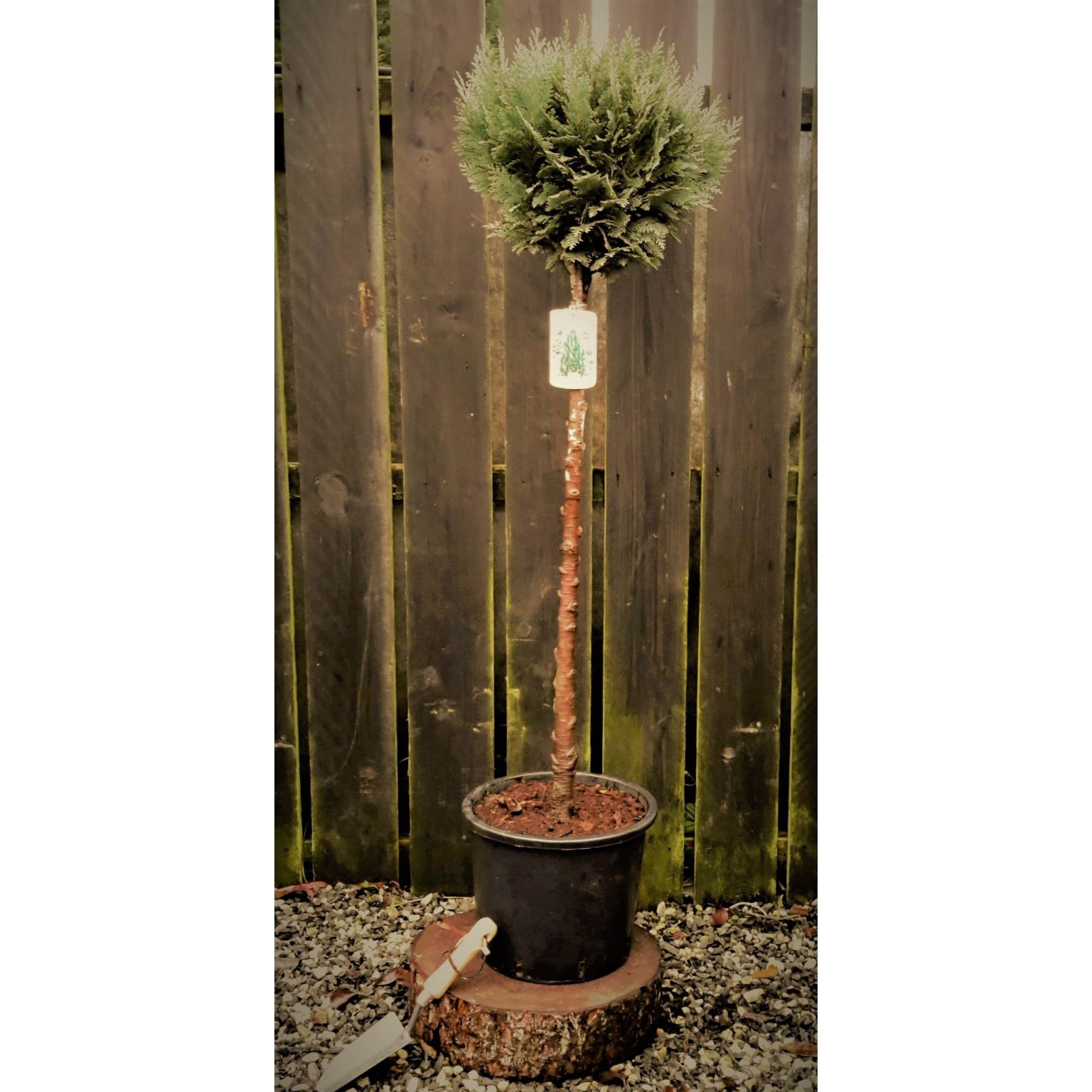 Chamaecyparis columnaris is a slow growing ornamental evergreen conifer and this plant has been grafted on to a stem of 90cm to create a lollipop. Being grafted means the stem won't continue to grow, however the plant above the graft will continue to grow and mature. These conifers have a blue-grey leaf and can be clipped as and when required in order to maintain it's shape.