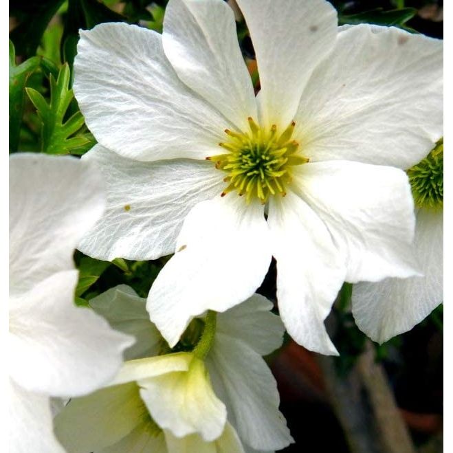 This is a slow growing evergreen variety of clematis that produces small bronze leaves that turn green as they mature. In spring it is covered in white scented bell shaped flowers with a greenish centre. Clematis grow best with their tops in the sun but their base in the shade. This can be achieved simply by placing some stones around the bottom of the plant. It's best to plant the crown of the plant approximately 5cm below the surface of the soil as this encourages new shoots to grow from below ground level. These climbers are suitable for gardens with clay soil. This clematis is in pruning group 1, meaning it needs very little to no pruning. It can be pruned lightly to keep it tidy and in shape.