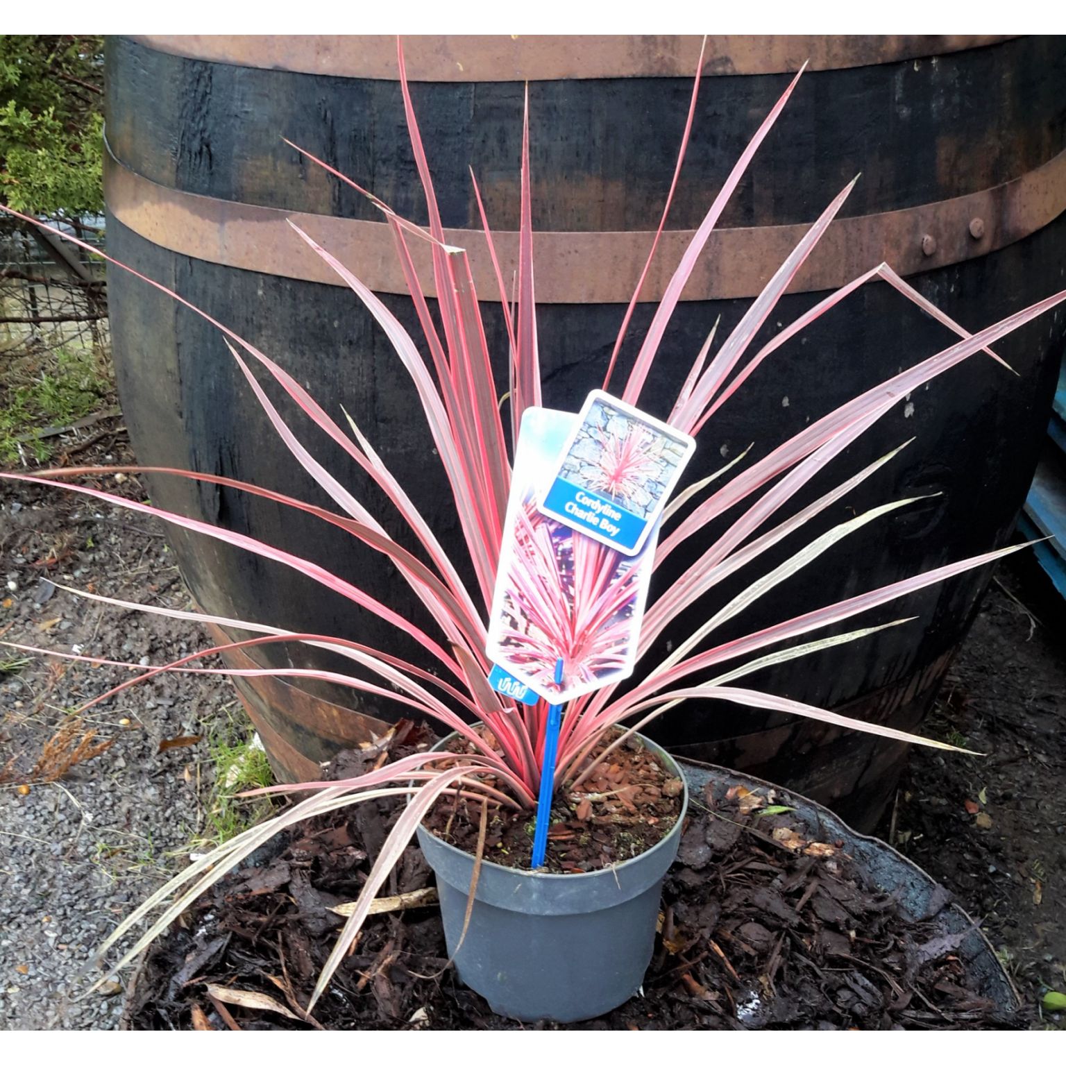 Charlie Boy is an evergreen tree/palm that has an exotic appearance with its sword shaped reddish purple edged leaves. They form a tall narrow trunk and as the outer leaves begin to yellow they can be removed revealing more of the trunk as it grows. Cordylines often produce new shoots from the base creating a multistem effect and as the plant matures fragrant creamy white flower spikes grow from the centre of the leaves in the summer months. It is drought tolerant and when young the leaves should be gathered and tied together in the winter in order to protect them from severe frosts.