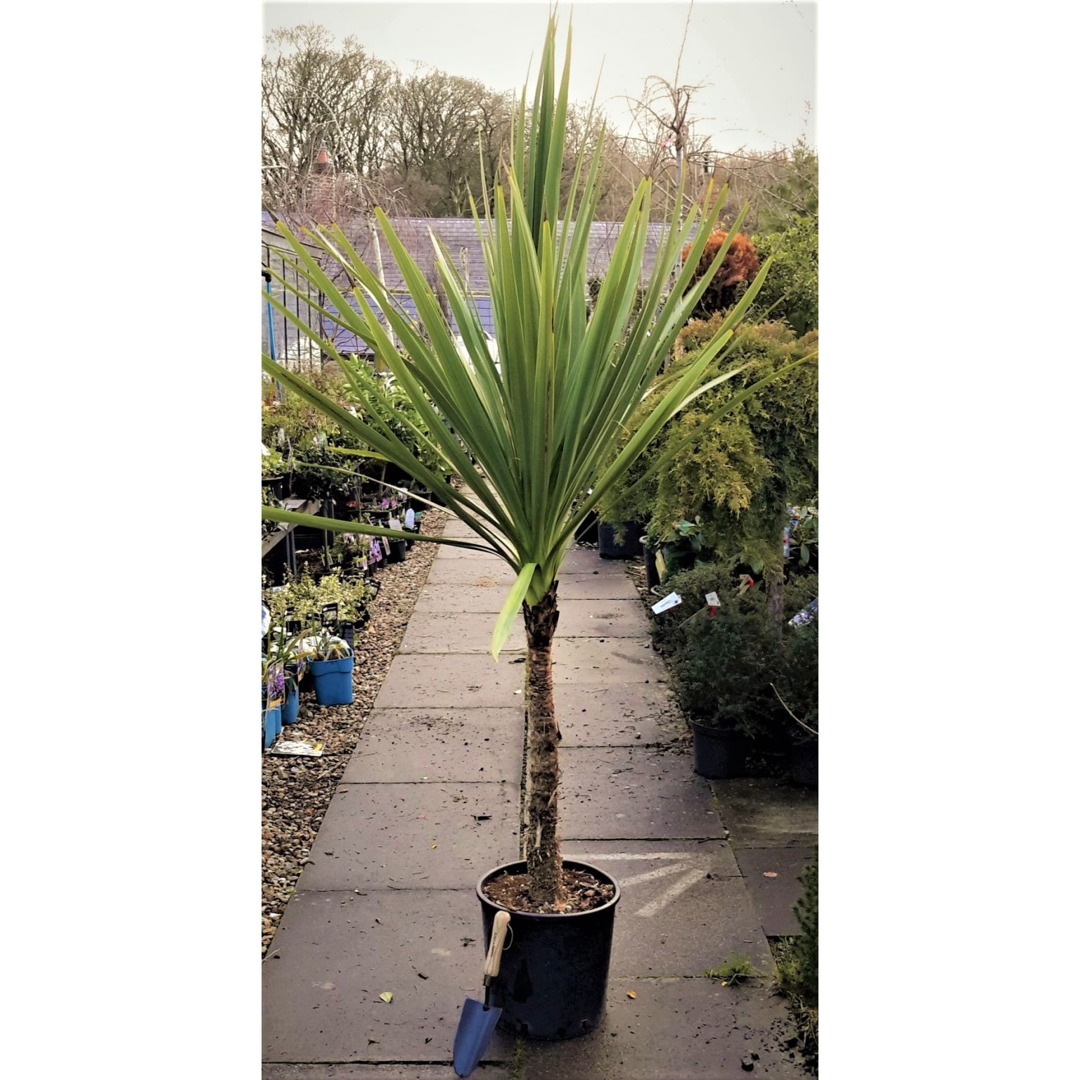 Cordyline Australis is an evergreen tree/palm that has an exotic appearance with its sword shaped green leaves. Cordylines are easy to grow, can withstand strong winds and they are drought tolerant. They form a tall narrow trunk and as the outer leaves begin to yellow they can be removed revealing more of the trunk as it grows. Cordylines often produce new shoots from the base creating a multistem effect. As the plant matures fragrant creamy white flower spikes grow from the centre of the leaves in the summer months.