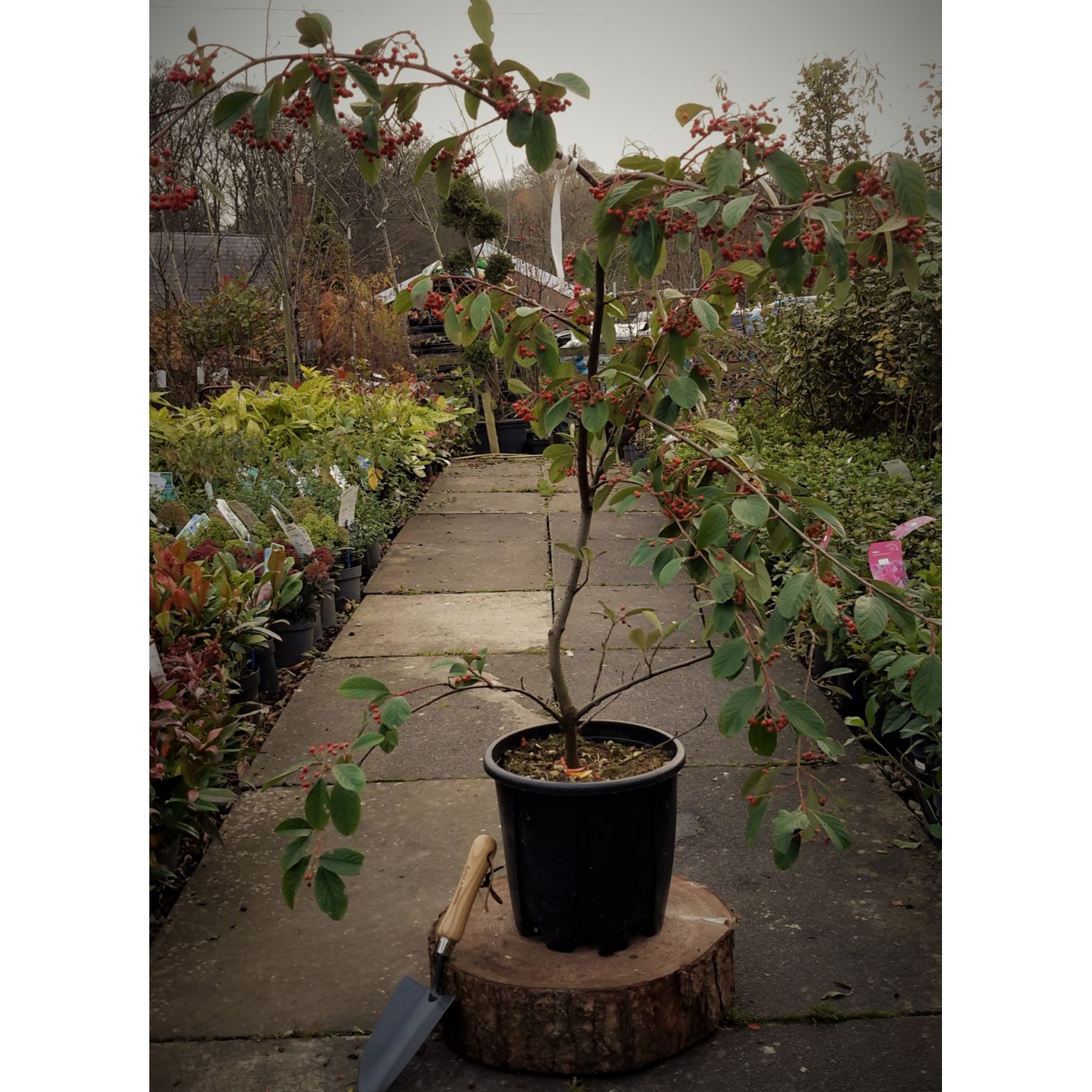 This variety of Cotoneaster is evergreen, it has long arching branches that produces clusters of small white flowers in the summer followed by bright red berries in the autumn. They only grow to 4m when fully mature making them a great option for smaller gardens as well as larger ones. Cotoneaster are very easy to grow as they will tolerate dry conditions and also do well in clay soil.
