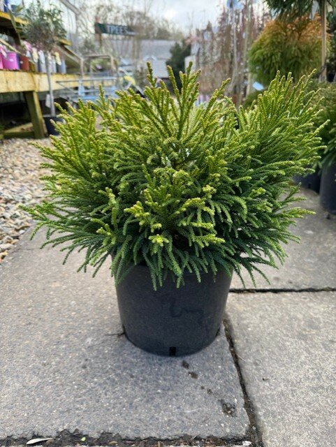Cryptomeria 'Little Diamond" has thinner, firmer foliage than the globosa nana variety and is a slow growing evergreen conifer with ornate pendulous branches. This variety forms a soft dome of green foliage which emerges yellow in spring and takes on attractive blue tones in the winter. These conifers are suitable to be grown in clay soil.