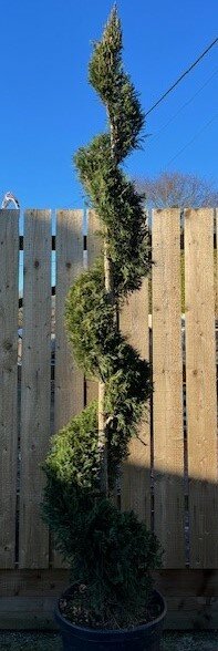 This conifer has been clipped in the form of a spiral. It will make as statement grown in pots or planted directly in the ground. They have green foliage and can be clipped as and when required to keep them in shape. They can be grown in full sun or partial shade and are suitable for clay soil.