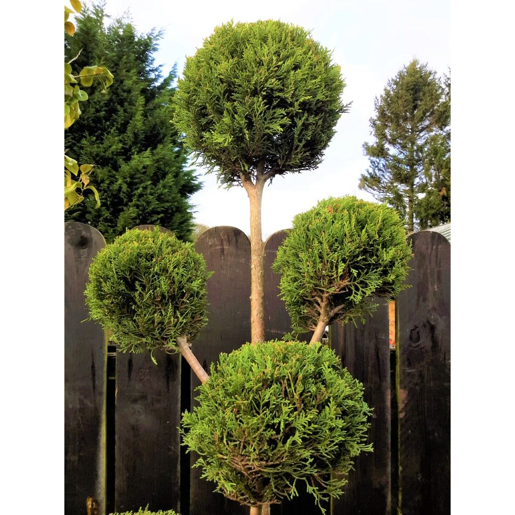 This conifer has been clipped to form pompoms and can be grown in pots or in the ground. They have green-gold foliage and can be clipped as and when required to keep them in shape. They can be grown in full sun or partial shade and are suitable for clay soil.