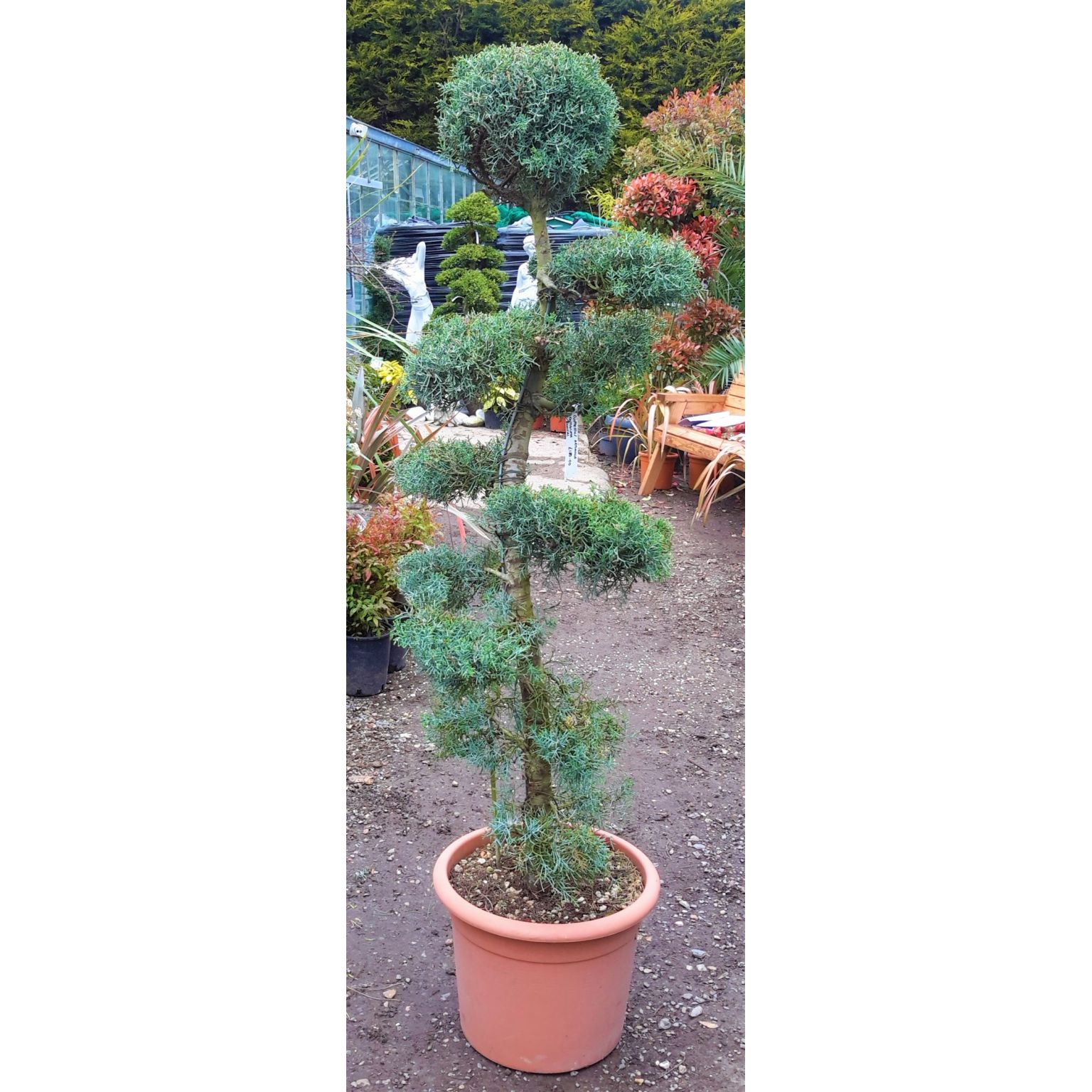 Cupressus Arizonica Fastagiata is an evergreen conifer with a narrow conical growing habit. Its foliage is silvery-blue and in spring they produce small yellow cones. This conifer has been clipped into tight pom poms creating a Bonsai effect. Control size with regular clipping.