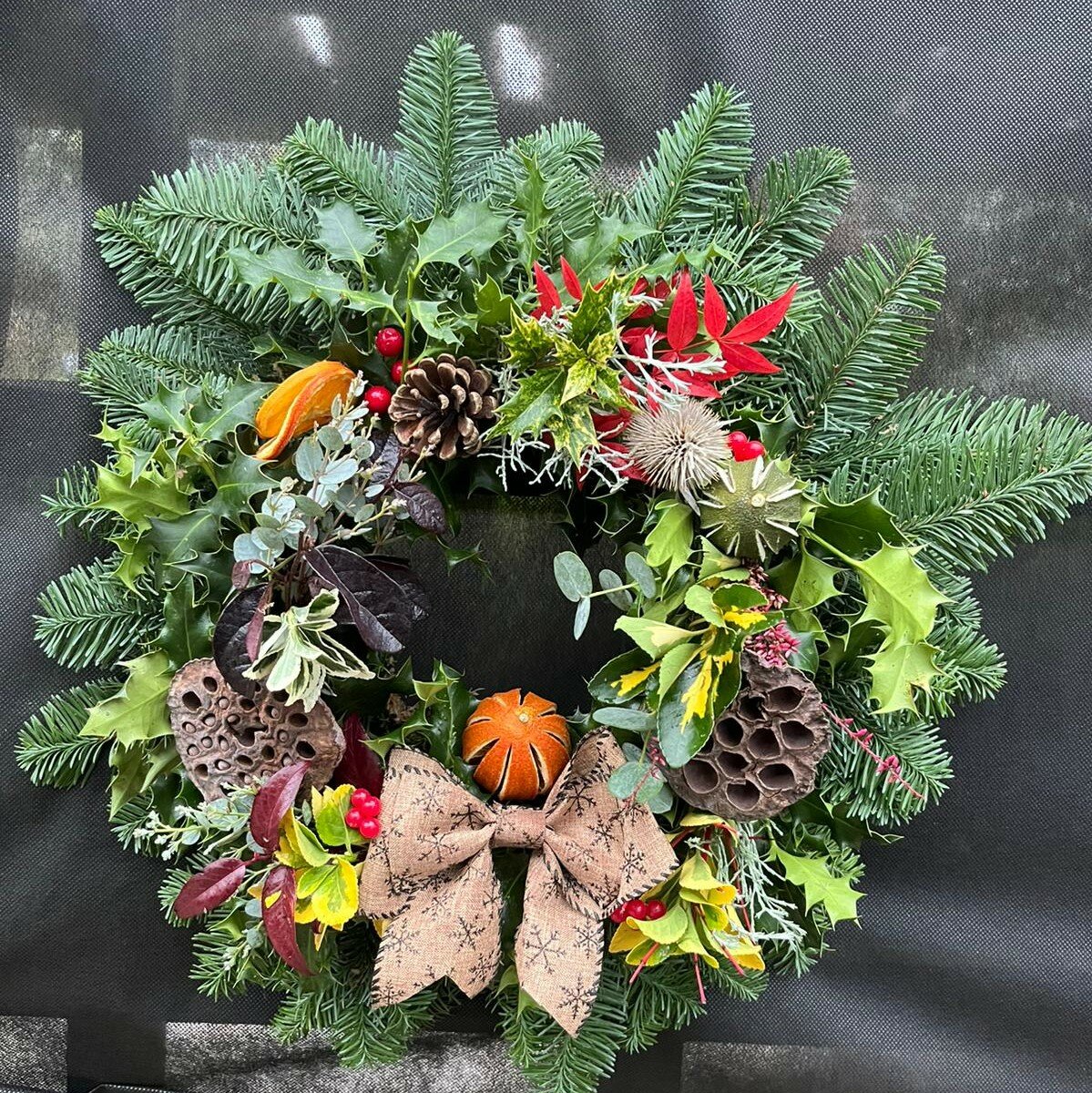 - Large (35cm) and Small (25cm) hand-made circular wreath, with large hessian bow at the bottom, specifically designed for front doors