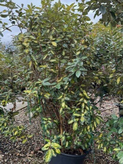 This elaeagnus has been grown as pleached high standard, ideal for creating privacy above a fence line. These can be clipped as and when required. It is a low maintenance evergreen shrub with deep green leaves with splashes of bright yellow through the foliage. In autumn it produces small creamy white fragrant flowers. Elaeagnus are suitable for gardens with clay soil and they are also drought tolerant.