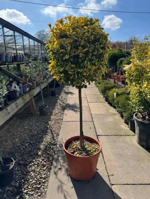 Euonymus Aureomarginata is an evergreen upright growing compact shrub that has oval dense green leaves with a yellow variegated edge. This variety, grown as a half standard, can be clipped and shaped as and when required. Euonymus are suitable to be planted in clay soil, can be grown in sun or shade and are drought tolerant.