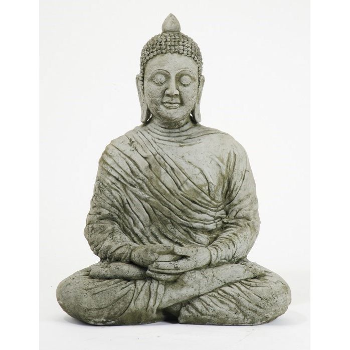 The finish of this majestic 130kg large Buddha sitting with eyes closed, in a cross-legged meditational position, has been aged to look older than the other statues in the range - cracks in the draped robe have been emphasized to look worn • Cast-Stone • Manufactured in Britain • Quality finish