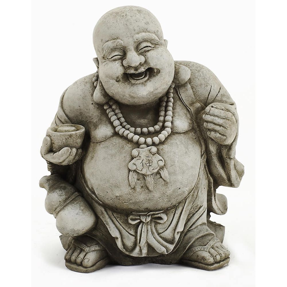 A symbol of abundance and happiness this standing Buddha is carrying a pot in one hand and is wearing a detailed double-stranded bead necklace • Cast-Stone • Manufactured in Britain • Quality finish