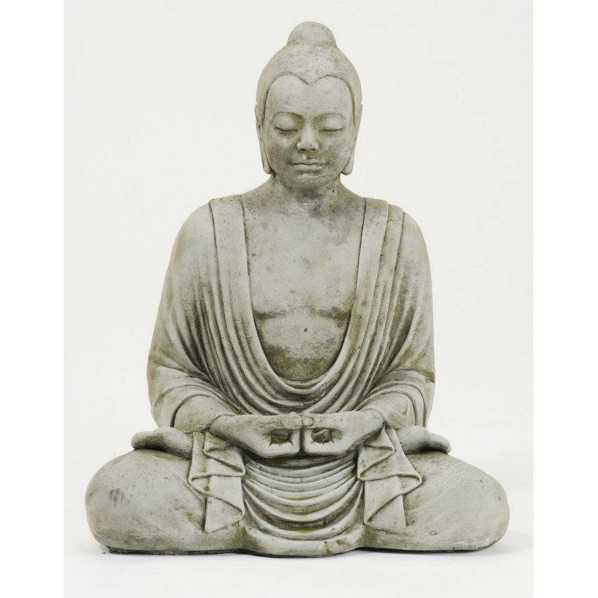A large Buddha with eyes closed, sitting in a cross-legged meditational position - robe draped in symmetrical pattern over the body • Cast-Stone • Manufactured in Britain • Quality finish