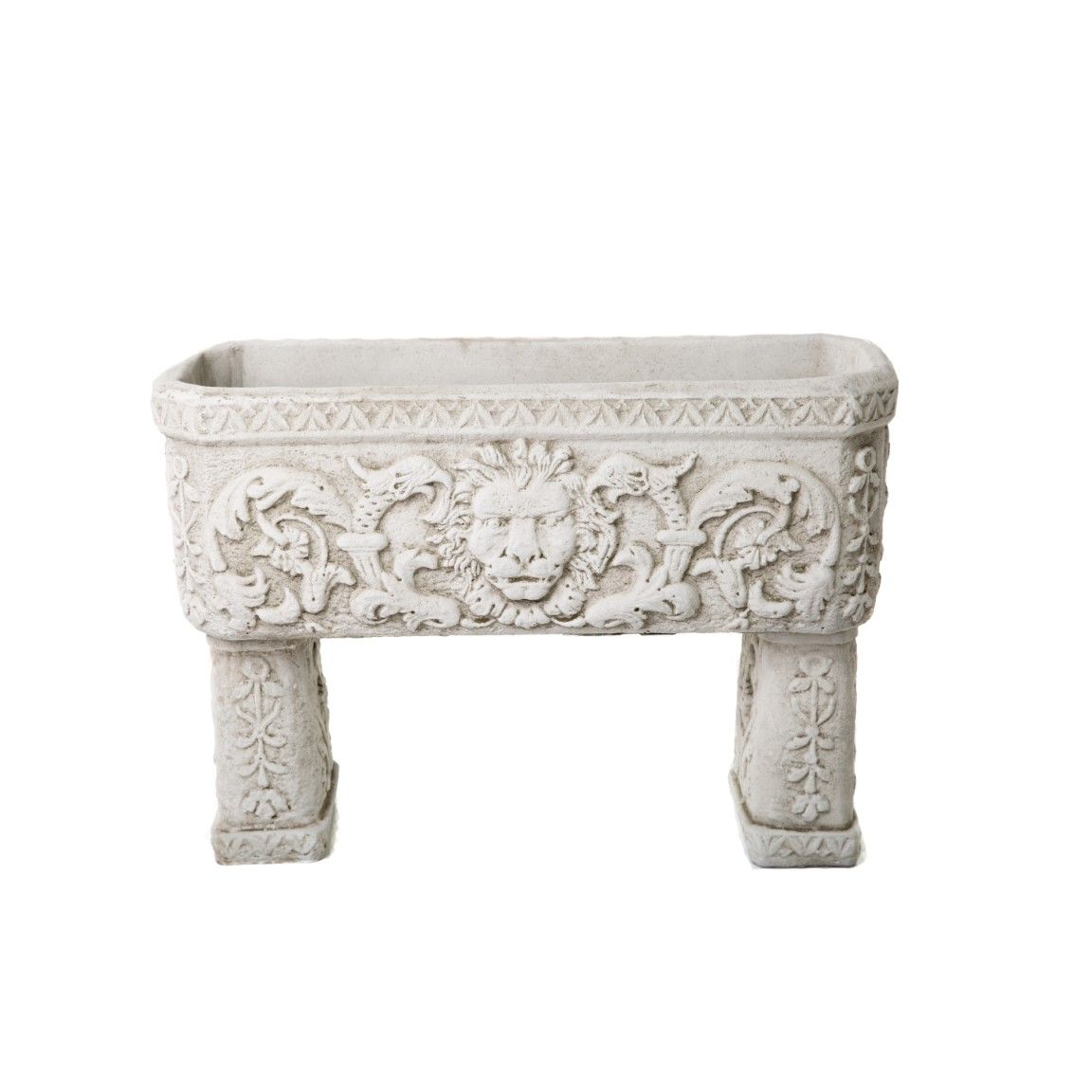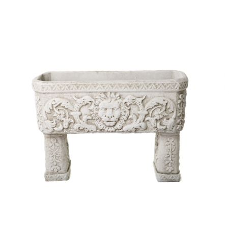 Stunning tall trough firmly balanced on two wide separate plinths. Lion head design on both long sides with elaborate scrolling complete this decorative planter.