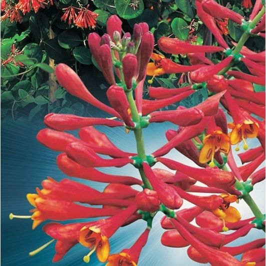 Dropmore Scarlet is a vigorous semi evergreen variety of honeysuckle. It has a long flowering period displaying bright scarlet trumpet shaped blooms from mid summer into autumn followed by small red berries in the autumn. Honeysuckle are loved by bees and are suitable for gardens with clay soil.