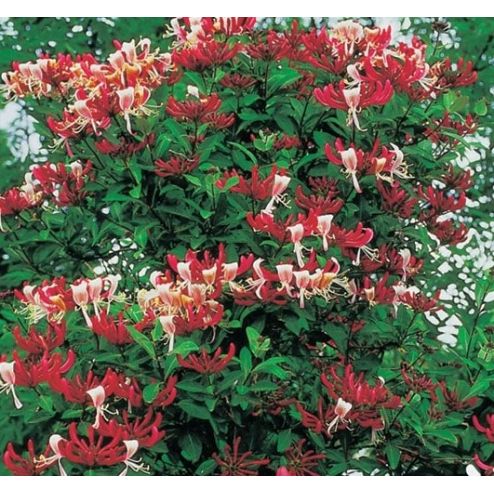 This is a deciduous fast growing honeysuckle. In summer it produces fragrant deep red flowers on the outside with yellow flowers on the inside. The flowers are followed by red berries in the autumn. Honeysuckle are loved by bees and are suitable for gardens with clay soil.