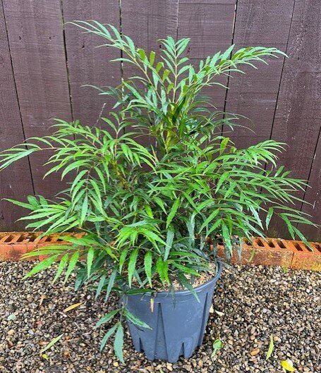 Mahonia Nara Hiri is an evergreen shrub that produces spikes of bright yellow flowers in autumn and winter followed by black and purple berries. Unlike other mahonia that is sharp and spikey this variety has soft textured leaves and appear almost fern like. They grow best in a shady area and are suitable to be planted in clay soil.