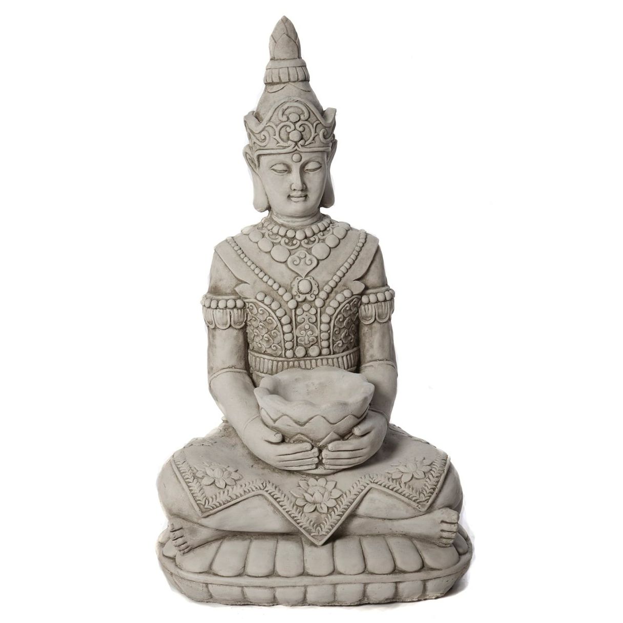 Traditional statue of the deity sitting in the lotus position holding a bowl in both hands. Wearing a fine-detailed robe and pointed headgear.