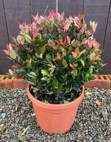 Photinia Chico is an evergreen compact shrub which is a darker, more orange/gold variety that the more well known red robin variety. The new growth on these shrubs is burnt orange and fades to a deep golden brown as it matures. These shrubs can be planted individually or they can be planted on mass to produce a colourful short, evergreen hedge or low border. It's best to trim on a regular basis as it encourages them to bush out and thicken. These shrubs are suitable to be grown in clay soil.