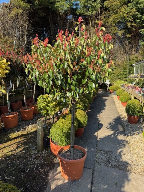 This photinia has been clipped into a 1/2 standard, its stem is 90cm, the head is 70cm and 100cm, giving a total height of 160cm.