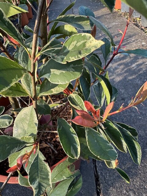 Photinia Louise is a variegated version of photinia red robin. It is evergreen with an upright and compact growing habit and it is known for its pink and green leaves with a cream and white variegation. its new growth appears bright pink that fades as it matures. They can be planted individually or they can be planted on mass to produce a colourful evergreen hedge. These shrubs are suitable to be grown in clay soil.