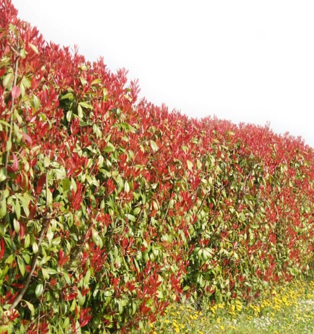 Photinia Red Robin is an evergreen shrub known for its striking red foliage. The new growth on these plants is bright red and fades to a deep green as it matures. These shrubs can be planted individually or they can be planted on mass to produce a colourful evergreen hedge. It's best to trim these photinia red robins on a regular basis as it encourages them to bush out and thicken. They are suitable to be grown in clay soil.