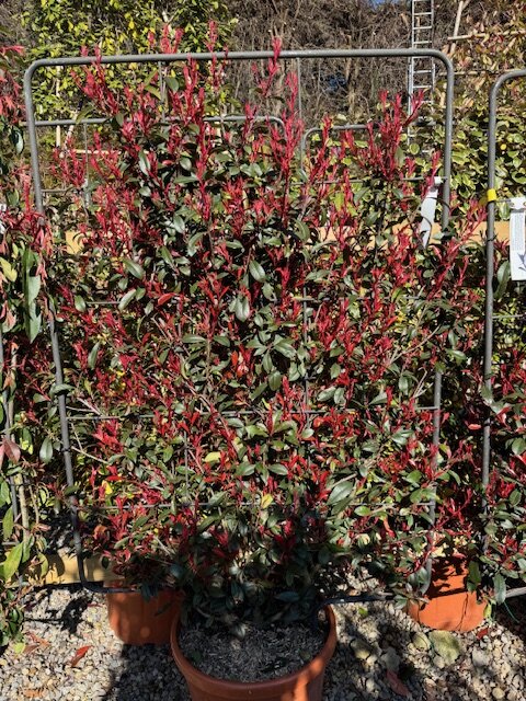 Photinia Red Robin Compacta is an evergreen compact shrub known for its striking red foliage. The new growth on these shrubs is bright red and fades to a deep green as it matures. These shrubs can be planted individually or they can be planted on mass to produce a colourful evergreen hedge. It's best to trim these photinia red robins on a regular basis as it encourages them to bush out and thicken. These shrubs are suitable to be grown in clay soil.
