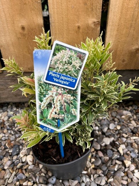 This variety of Pieris is evergreen with an upright compact growing habit. It has variegated leaves and new growth on this shrub appears pink. In spring attractive delicate urn shaped white flowers are produced that hang down from the plant in clusters. Pieris need acidic soil so should be planted with ericaceous compost or fed with ericaceous feed. Pieris will grow well in both sun and shade.