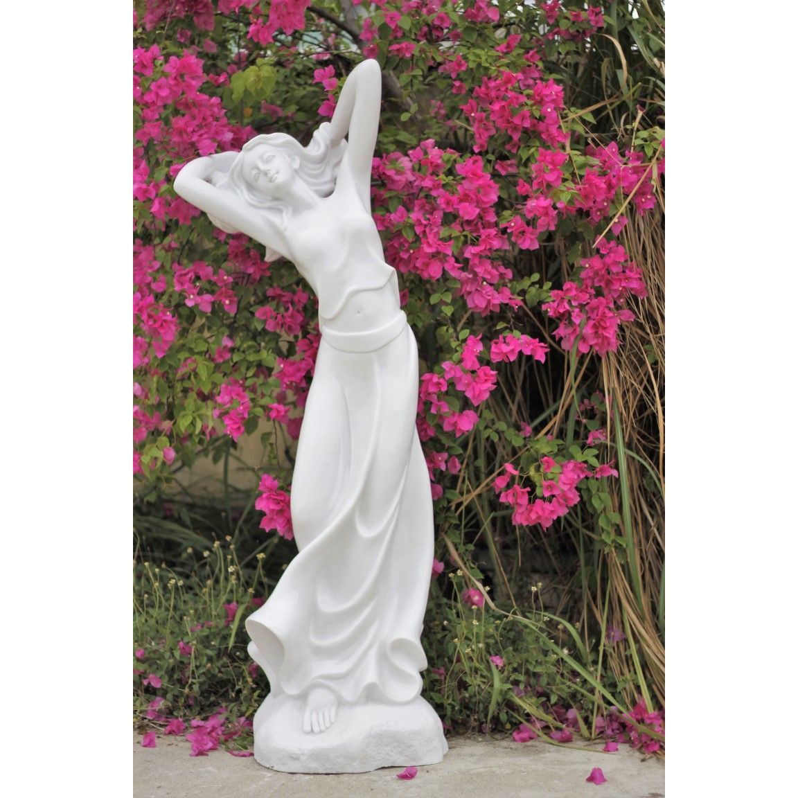 • Statue of a happy long-haired beauty standing on a rock with her arms raised behind her head holding her hair, draped in a soft long skirt that looks like it is blowing gently in the breeze