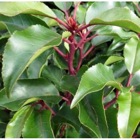 Brenelia is an elegant variety of the popular Portuguese laurel from the early 21st century. This plant has been grown as a half-standard. The stalks and new stems are rich burgundy red not only in winter but most of the growing season. It grows moderately and very dense into a regular, pyramidal shrub. White, sweetly scented flowers appear in late May and early June.