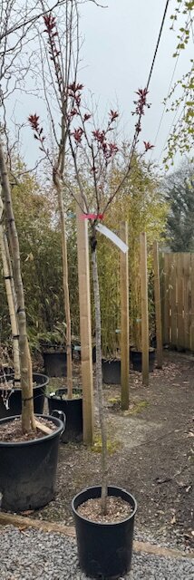(Taiwan Cherry).This is an ornamental cherry tree. The tree is deciduous and produces beautiful double cup-shaped pink flowers in late spring before its new burgundy coloured leaves appear. This tree has been made into a high standard by grafting the plant onto a clear stem of 140cm, the head above is 80cm, giving a total height of 220cm. Being grafted means the stem won't get much bigger but the canopy above the graft will continue to grow and mature. These trees like a sunny position and are suitable for gardens with clay soil. Great autumn colour.