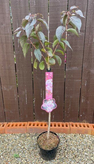 (Taiwan Cherry).This is an ornamental cherry tree. The tree is deciduous and produces beautiful double cup-shaped pink flowers in late spring before its new burgundy coloured leaves appear. This tree has been made into a high standard by grafting the plant onto a clear stem of 60cm. Being grafted means the stem won't get much bigger but the canopy above the graft will continue to grow and mature. These trees like a sunny position and are suitable for gardens with clay soil. Great autumn colour.
