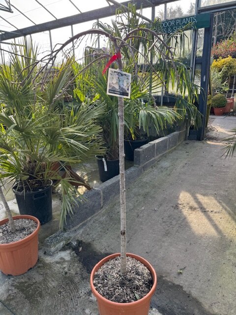 This is an ornamental cherry tree. The tree is deciduous and produces beautiful bowl shaped pale pink flowers that fade to white in late spring before its new leaves appear. This tree has been made into a 1/2 standard by grafting the plant onto a clear stem of 120cm with a head that is approx 60cm wide. Being grafted means the stem won't get much bigger but the canopy above the graft will continue to grow and mature. These trees like a sunny position and are suitable for gardens with clay soil. Great autumn colour.