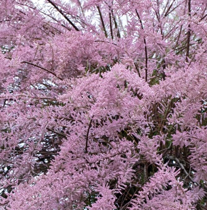 Tamarix Pink Cascade is a vigorous growing large shrub or small tree. It is known as salt cedar as it grows well in coastal areas and is often used as a wind break. It has delicate feathery leaves and produces plumes of rich pink flowers that will sway in the wind and attract bees.
