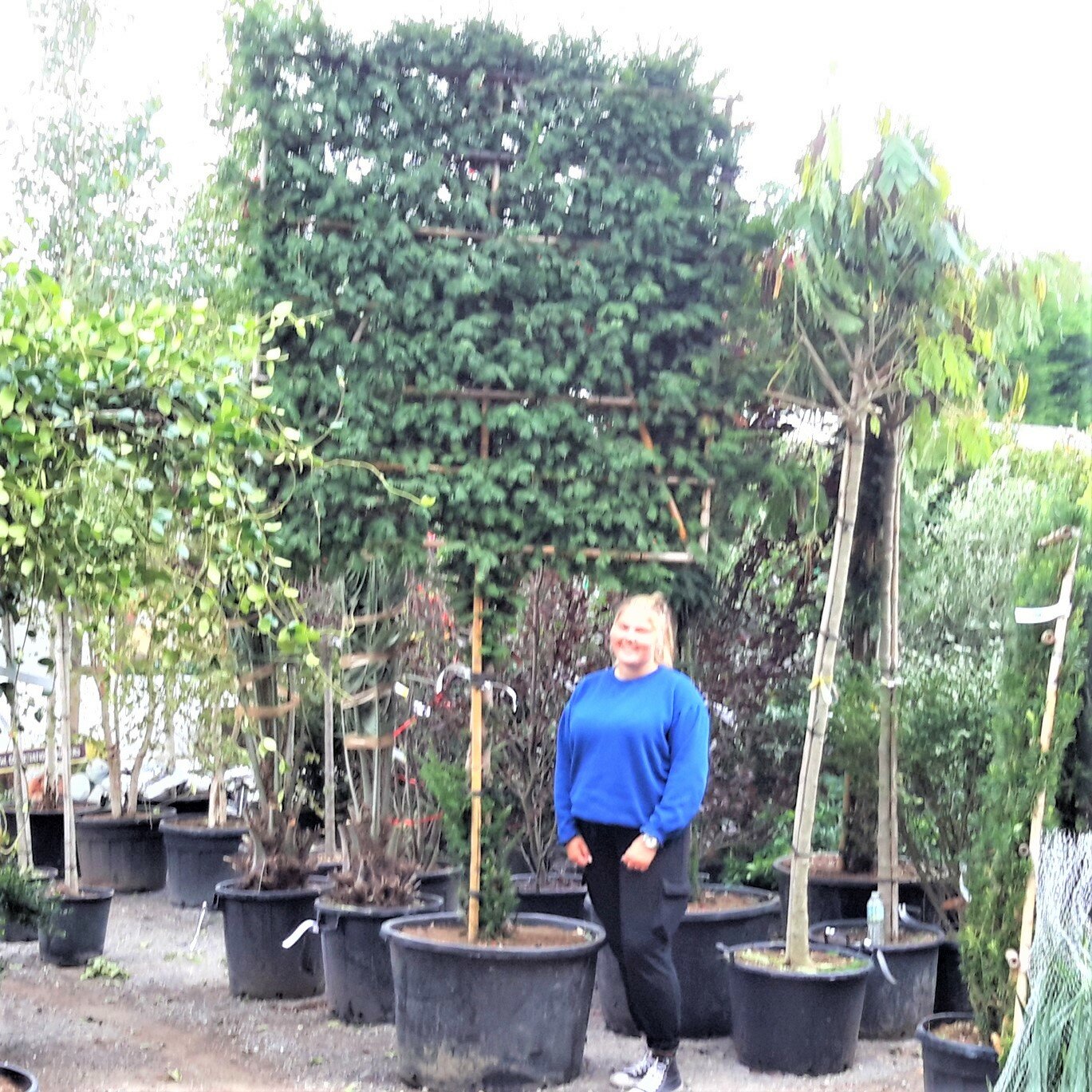 Grown as an impressive half standard espalier/pleached tree on a bamboo frame, this Taxus Baccata (otherwise known as yew), is a slow-growing, dense evergreen conifer that has a narrow form. Its foliage is dark green that will keep its colour throughout the year. It has been meticulously espaliered onto a flat, strong rectangular bamboo frame. This is a very low maintenance conifer that doesn't require any clipping or pruning except to tie onto the frame every year or two if necessary.