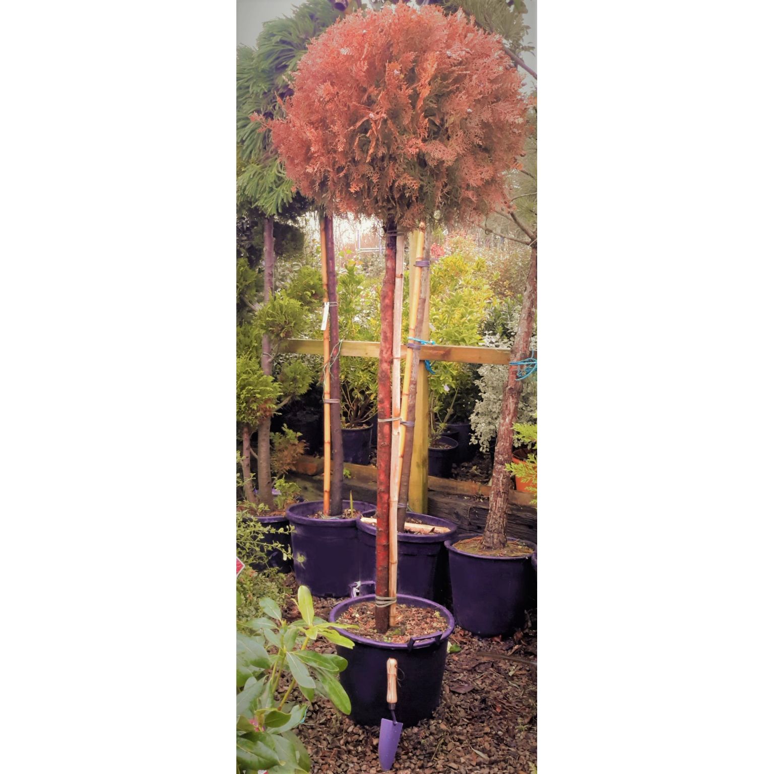This Thuja has been grown as a lollipop. The conifer has been grafted on to a clear stem of 130cm and this means the stem won't increase in size, however the conifer above will continue to develop. It can be clipped and pruned as and when required to keep it in shape. Thuja Aurea Nana is a slow growing evergreen conifer with green-golden foliage that turns red-orange in the winter. This plant can be grown in a pot or can be planted directly in to the ground.