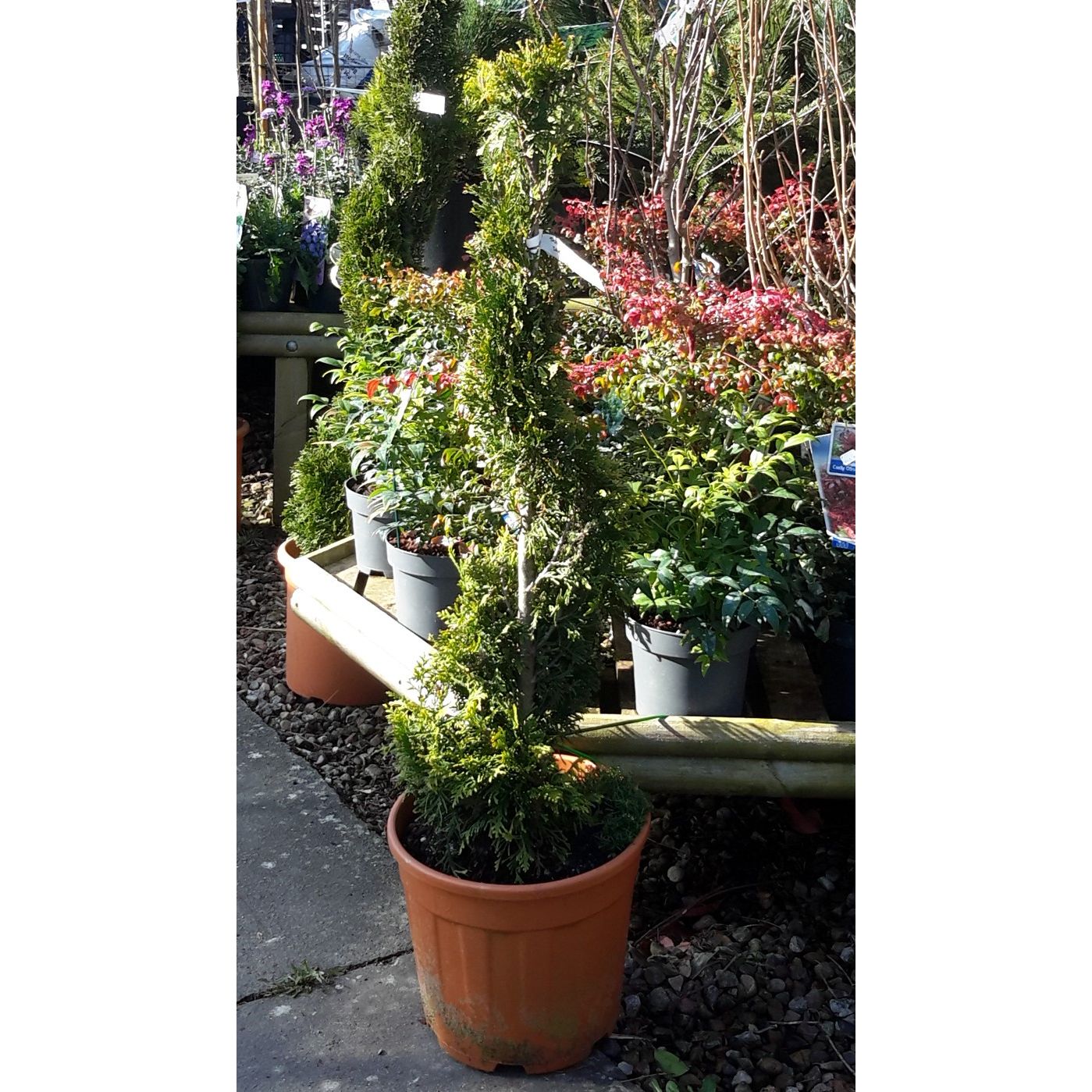 Golden Brabant' is a fast-growing, compact, conical, evergreen conifer with flat sprays of tiny, aromatic, scale-like yellow-green leaves. This conifer has been clipped into a spiral form. Superb focal point in a garden - plant it directly into the ground or into a container. Control height and width with trimming.