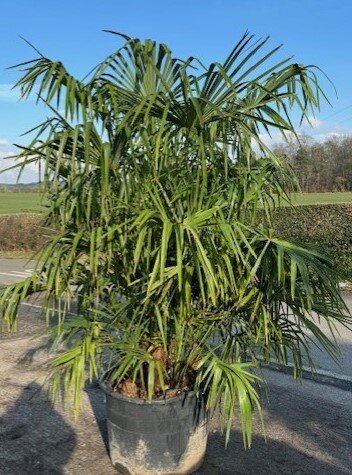 Trachycarpus Fortunei are a slow growing exotic hardy evergreen palms. They form a thick fibre covered trunk, with deep green fan shaped leaves that grow from the crown. As the outer leaves die off they should be cut off at the end of their stems and this is how the trunk develops. New leaves will appear again from the centre.