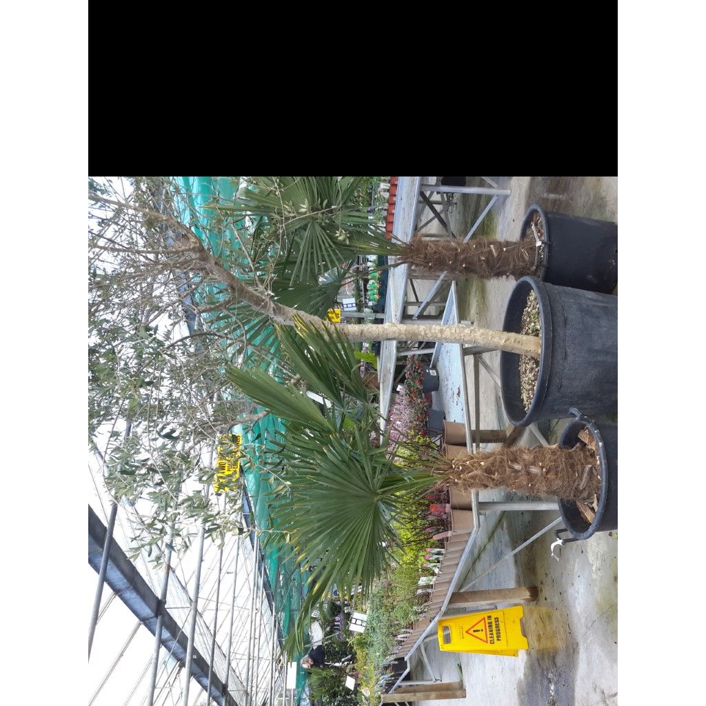 This is a slow growing exotic hardy evergreen palm. They form a thick fibre covered trunk, with deep green fan shaped leaves that grow from the crown. As the outer leaves die off they should be cut off at the end of their stems and this is how the trunk develops. New leaves will appear again from the centre.